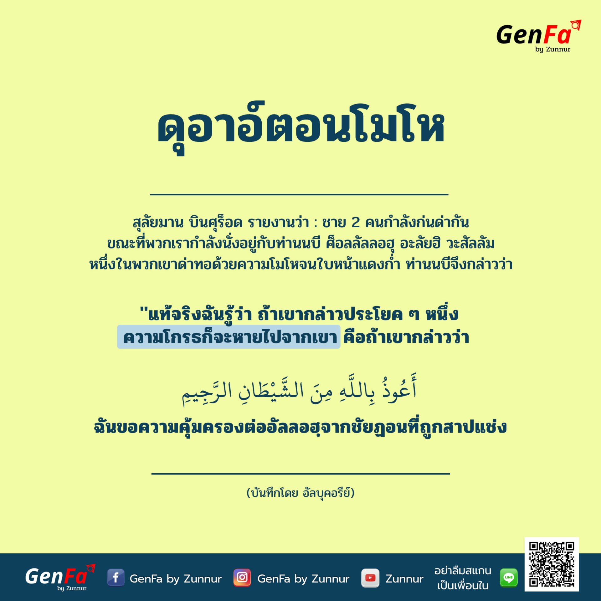 แท้จริงฉันรู้ว่า ถ้าเขากล่าวประโยค ๆ หนึ่ง ความโกรธจะหายไปจากเขา คือถ้าเขากล่าวว่า “ฉันขอความคุ้มครองต่ออัลลอฮฺจากชัยฏอนที่ถูกสาปแช่ง” (บันทึกโดยอัลบุคอรีย์ หะดีษเลขที่ 6115)