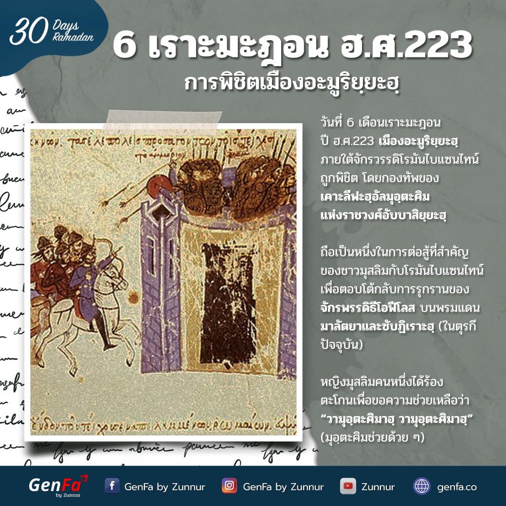 วันที่ 6 เดือนเราะมะฎอน ปี ฮ.ศ.223 เมืองอะมูริยฺยะฮฺ ภายใต้จักรวรรดิโรมันไบแซนไทน์ถูกพิชิต โดยกองทัพของ “เคาะลีฟะฮฺอัลมุอฺตะศิม” แห่งราชวงศ์อับบาสิยฺยะฮฺ